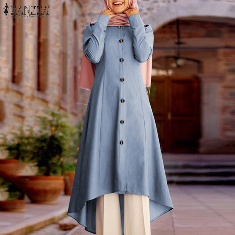 ZANZEA Women Muslim Dubai Evening Long Tops Button Down Solid Tunic Shirt Blouse