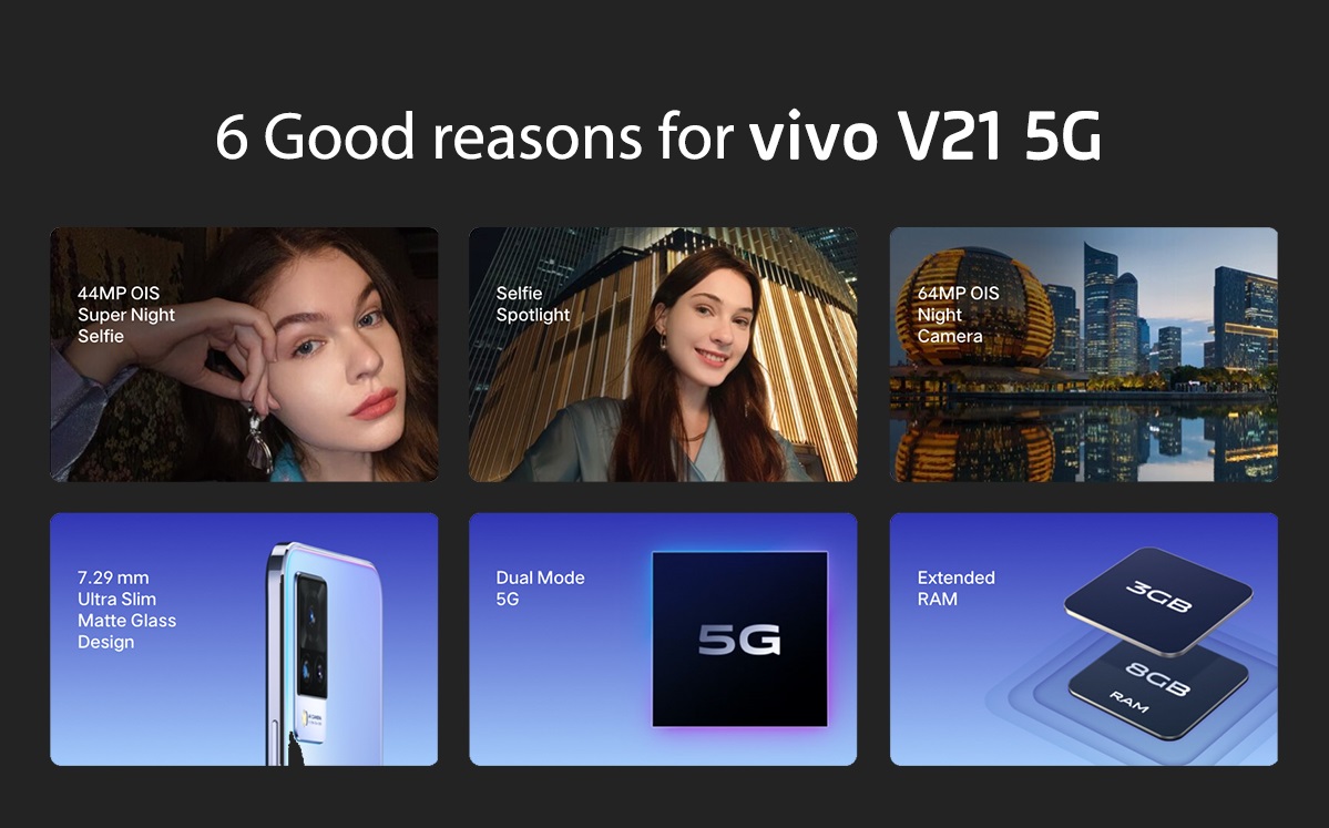 vivo V21 5G [8GB+3GB/128GB] 90hz Refresh Rate/44MP OIS Night Selfie/ 64MP OIS Night Triple Camera/ Dual Mode 5G【2 YEARS WARRANTY】