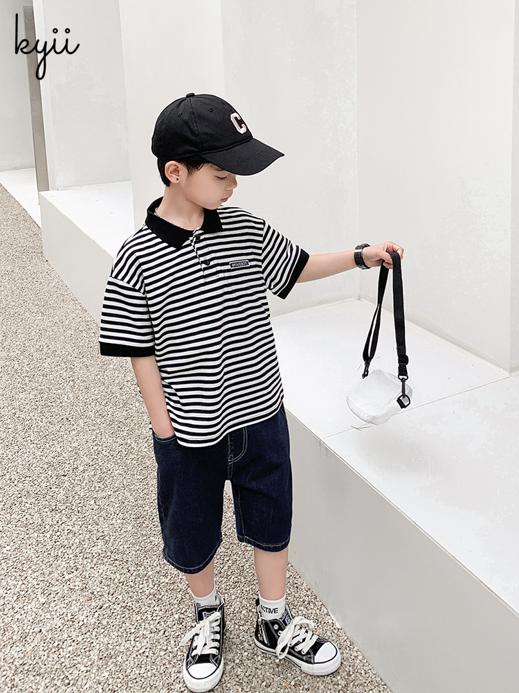 KYII stripe short sleeve Casual boys cotton summer loose shirt Korean Shirt kyb041